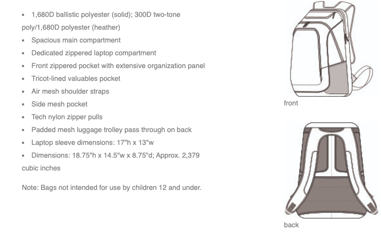 - Dimensions: 18.75"h x 14.5"w x 8.75"d; Approx. 2,379 cubic inches